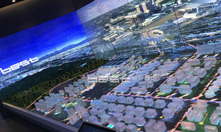 項目名稱:東旭展廳電子沙盤項目簡介:本沙盤盤面使用液晶屏制作,配合水晶建筑體塊;背面安裝液晶拼接屏;頂部安裝投影儀。沙盤內容與背景影片、盤面影片、頂部投影相結合,達到立體、協調展示的視覺效果;