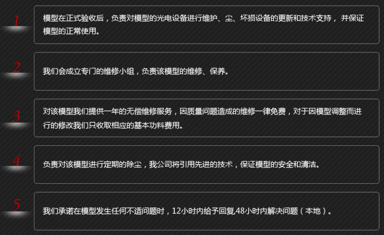 筆特模型公司制作的模型,一年保修、終身維護,我們負責運輸及現場組裝調試。在模型使用過程中,因模型質量問題發生維修費用,由我們公司自行承擔;因甲方問題或方案調整,我們只收取相應的成本費用。